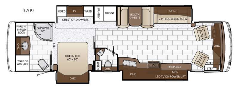 As you enter the coach, the full wall slide features a 74" hide-a-bed sofa, booth dinette, refrigerator, and pantry for your non-perishables, plus in the bedroom there are two wardrobes, chest of drawers, and an overhead TV. On the opposite side of the motor home there is a double kitchen sink on an angled countertop, three burner range, fireplace with LED TV on a power lift, and overhead cabinets stretching the whole length of the slide out.