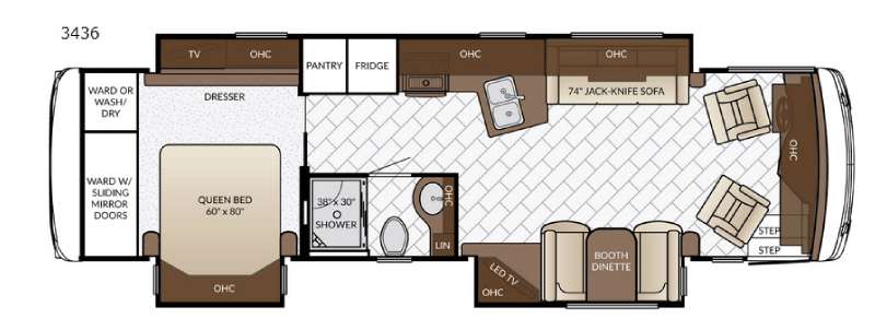 The Ventana LE 3436 class A diesel motor coach by Newmar offers a rear bedroom and triple slides. One of the slides is a full wall slide out which really helps to open up the coach.