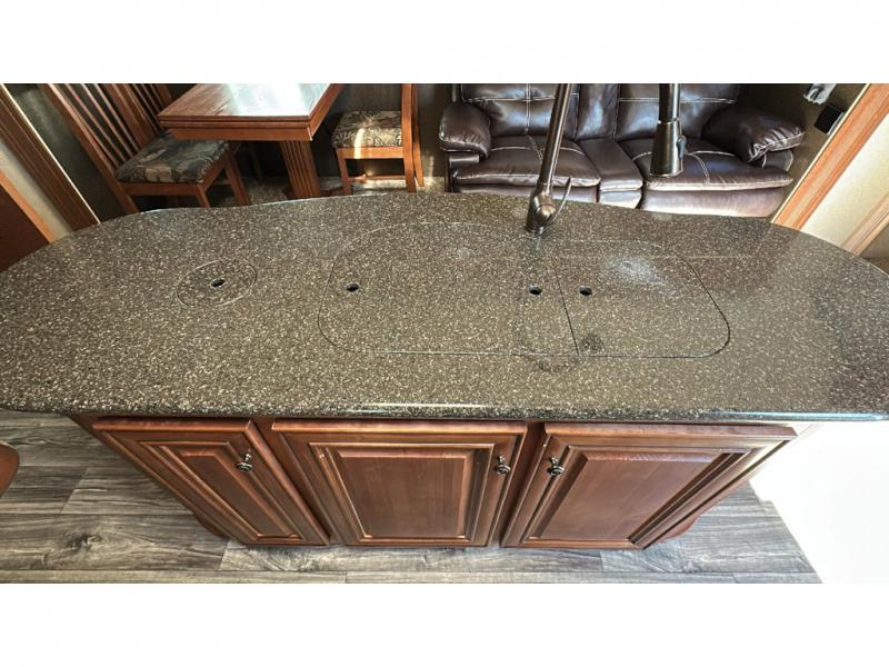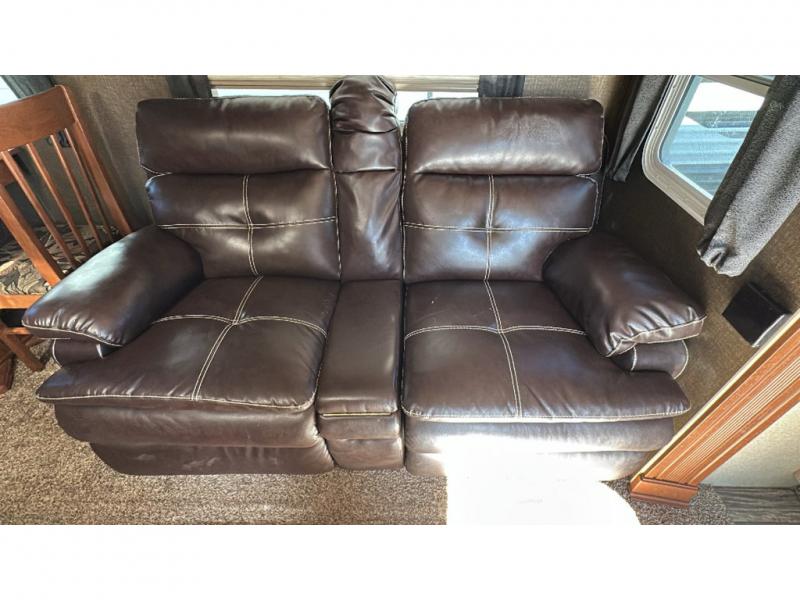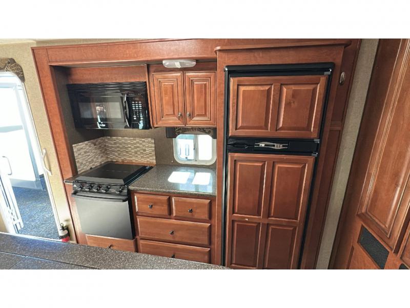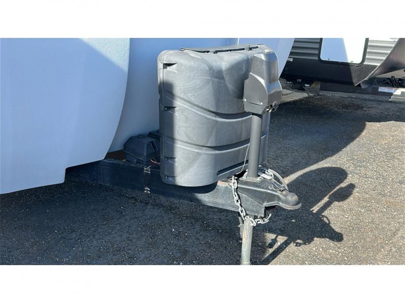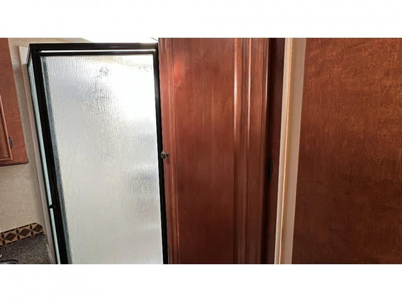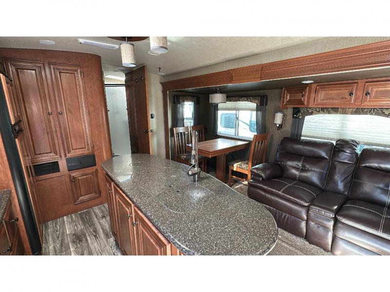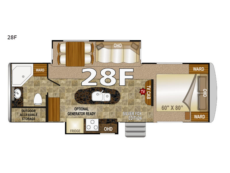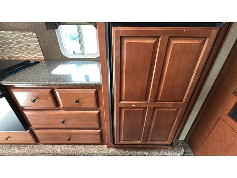 Step into the Silver Fox Edition Arctic Fox 28F to find two slide outs opposite each other for wide open living space. The slide to the left of the entry includes a refrigerator, a three burner range, counter space and overhead cabinets. There is a large storage pantry on the inside wall. A center kitchen island includes a double sink for easy clean up.