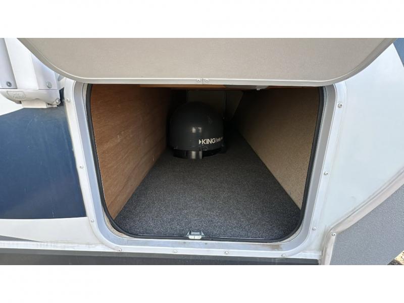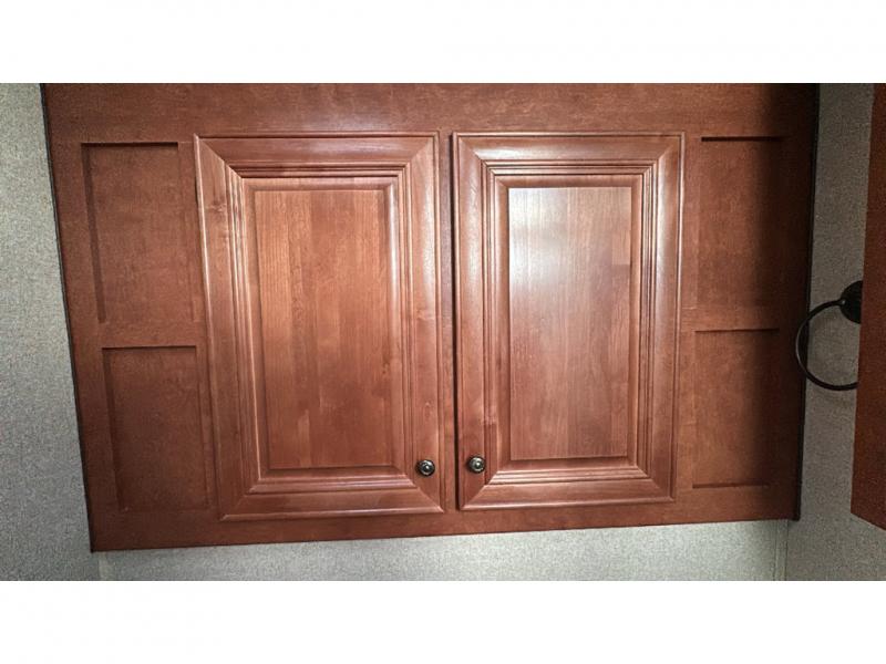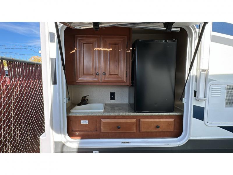 At the outside rear, there is a storage area. You may choose an optional exterior kitchen with overhead cabinets, a sink, and a refrigerator.