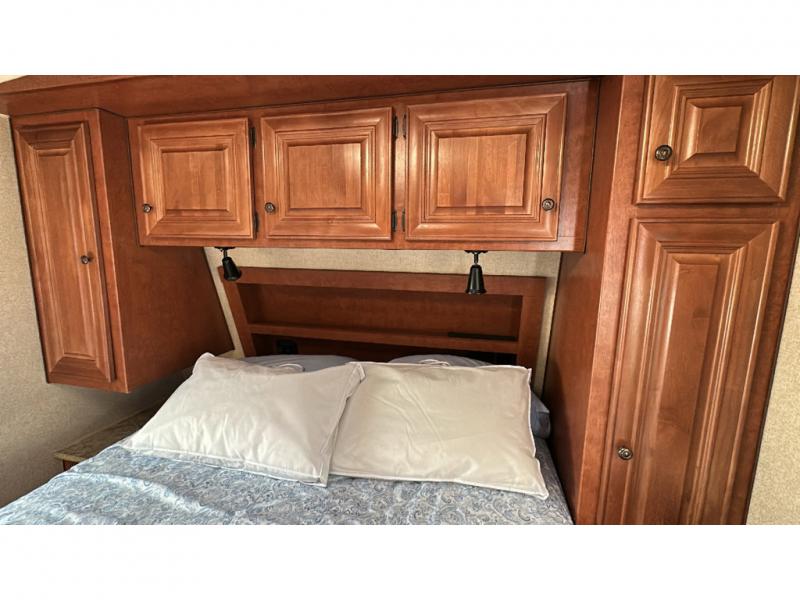 The front bedroom is accessible from either side of the TV cabinet and includes a queen bed, a wardrobe on each side and overhead cabinets.