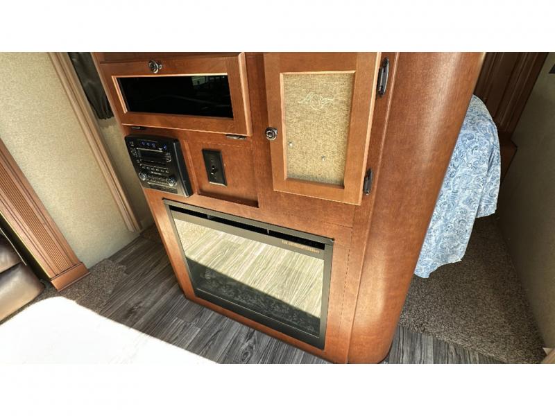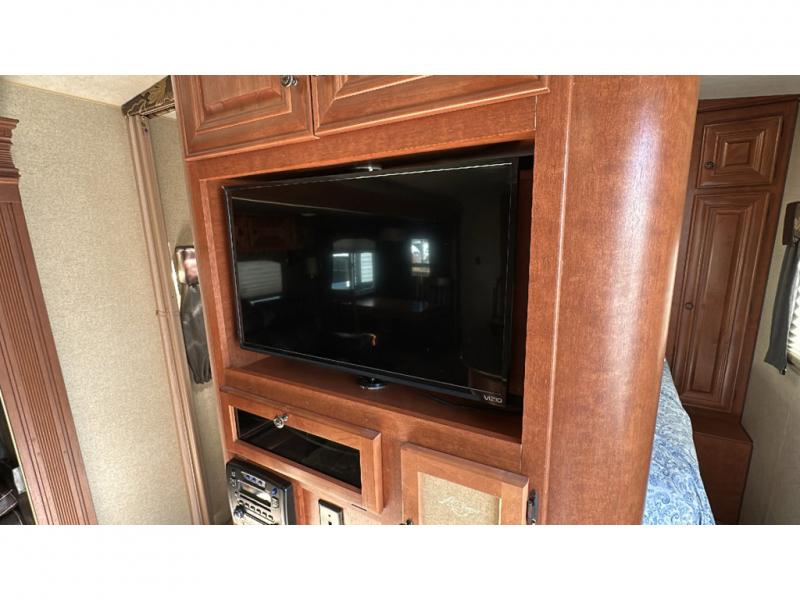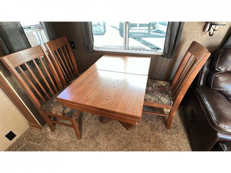 The opposite side slide out provides a jackknife sofa, overhead cabinets and a free standing dinette with four chairs. There is a TV cabinet and TV on the center of the front wall.
