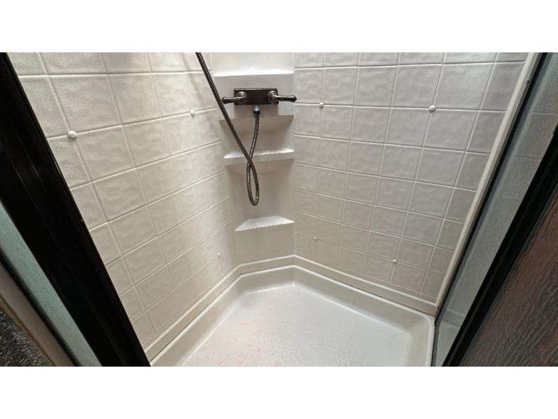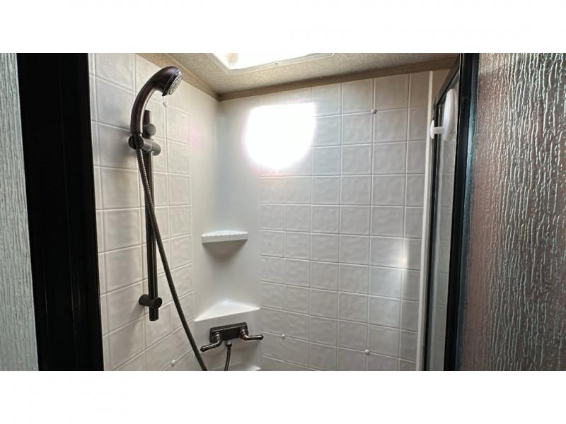 The rear full bathroom includes a wardrobe, a corner angled shower, a vanity sink, a medicine cabinet and a toilet.