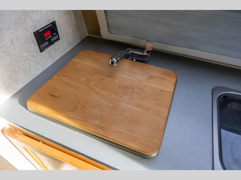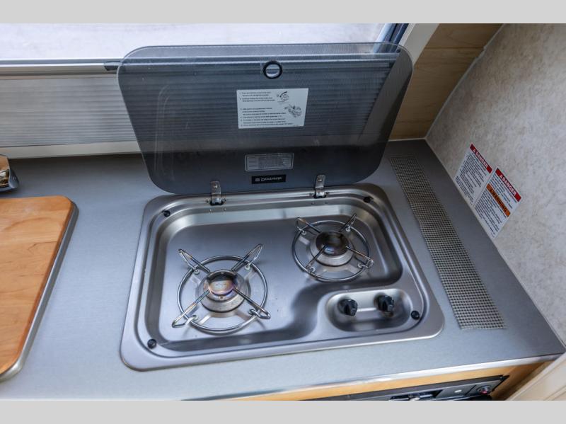 As you enter you will notice the front two burner stove top and single sink for light cooking and/or perking your morning cup of coffee.