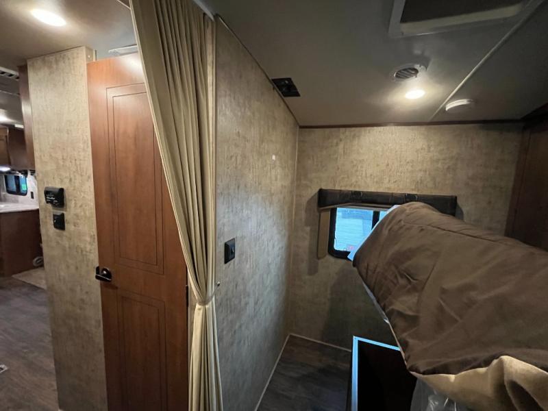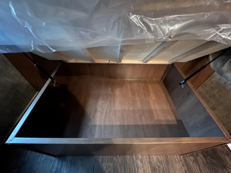 As you step inside the main entry you will find a refrigerator, three burner range, double kitchen sink, and counter space to make your favorite camp meals along the rear wall. The counter wraps around the corner along the road side wall including overhead cabinets for your dishes and things.