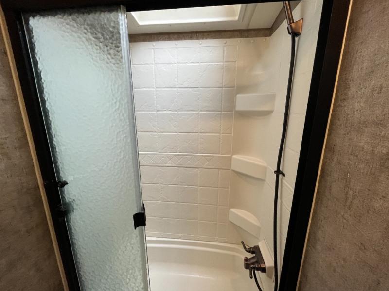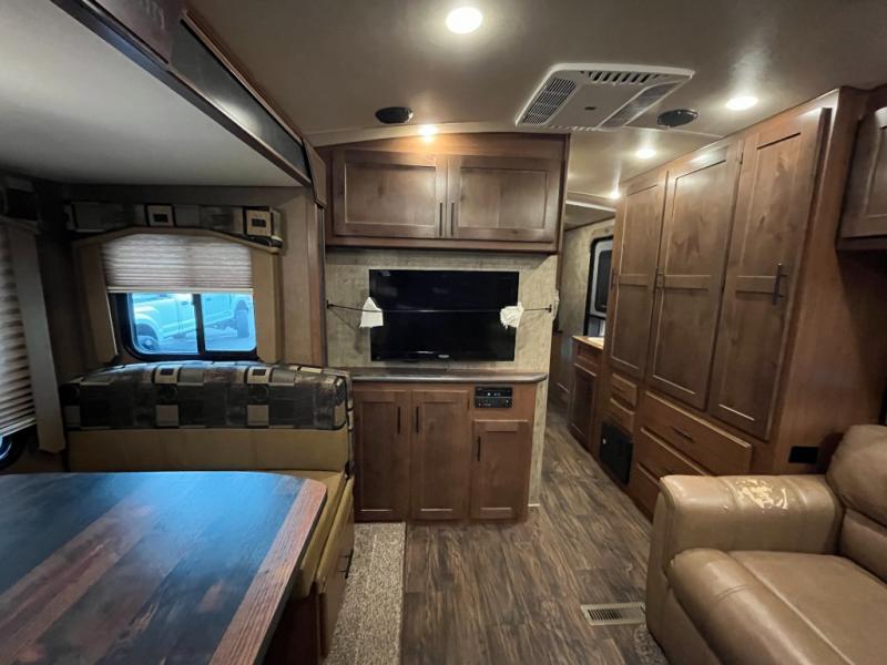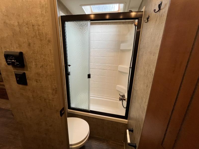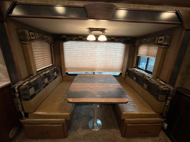 A road side slide out mountain dinette is perfect for mealtime, playing games, and provides sleeping space. In front of the dinette you are sure to enjoy the natural light provided by the skylight. Adjacent to the slide you will find an entertainment center with 32" LED TV for your inside enjoyment.