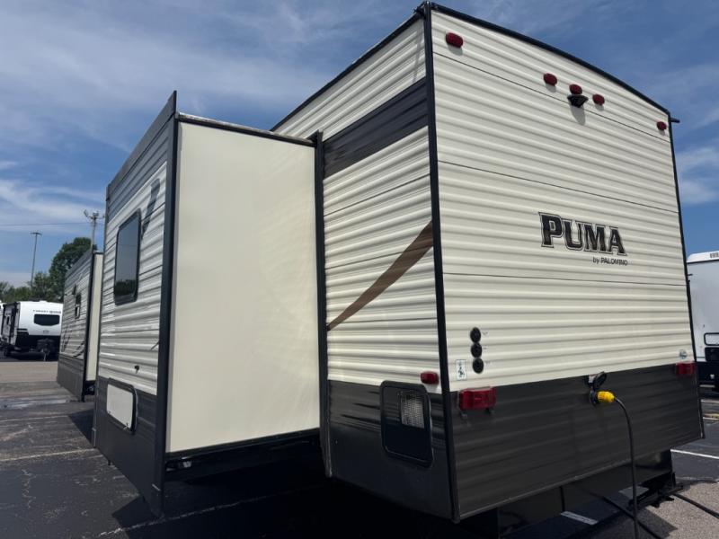 This destination trailer provides all you need to stay in one location for a while. From a front living area, kitchen island, and residential style refrigerator to dual recliners, this triple slide Puma 37-PFL by Palomino is sure to impress!