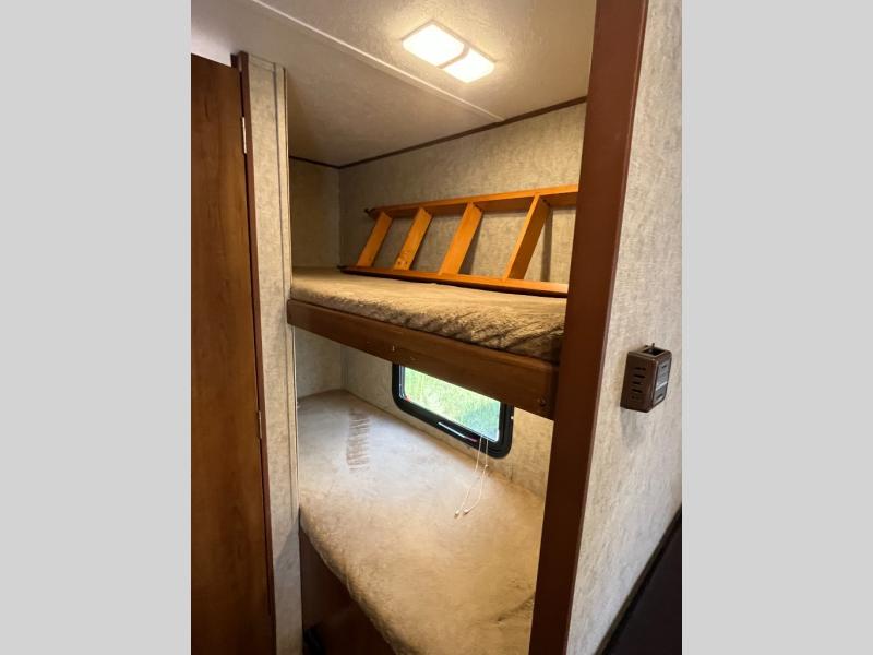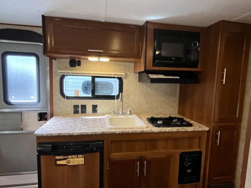 Upon entering the travel trailer, to the right there is a queen bed with an overhead cabinet. Next to the bed you will find a dinette and another overhead cabinet. Easily fix your meals in the kitchen area. Here you will find a refrigerator, sink, two burner range, and pantry.