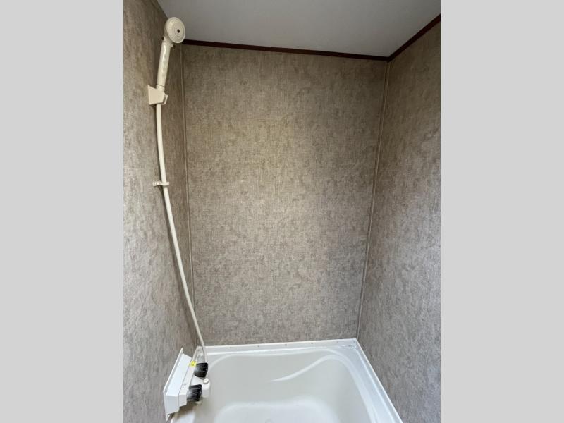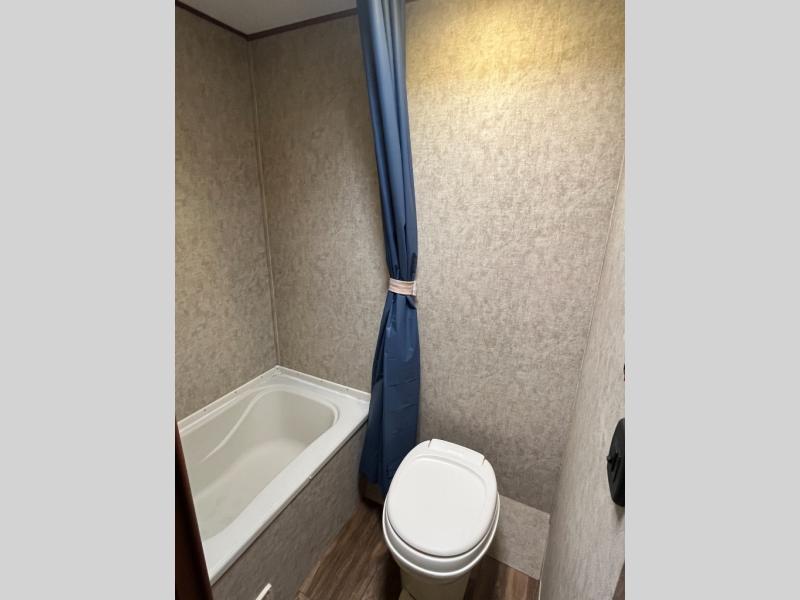 The bathroom is located in the left rear corner of the trailer. Here you will find a toilet and a tub.