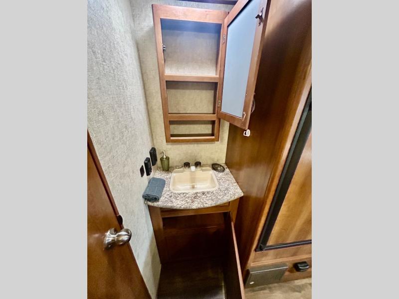 In the back of this Avenger ATI there is more sleeping space with a large double bunk above the exterior kitchen below. Right next door you will have the convenience of a private tub/shower and toilet, and a separate sink just outside the bathroom door, plus so much more!