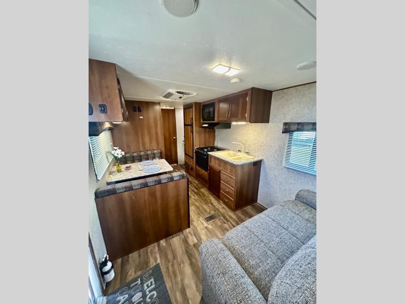 On the inside you will find a great kitchen also. As you enter you will find a booth dinette to the left of the entrance with the kitchen amenities along the road side. You will find a handy double sink for cleaning up and food prep, a three burner range, and refrigerator to keep your cold stuff cold!