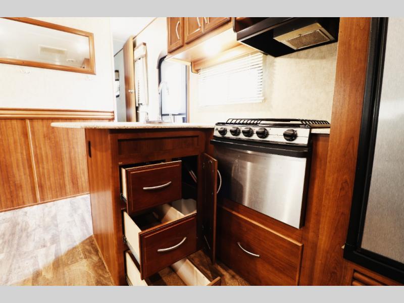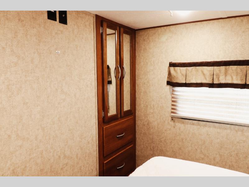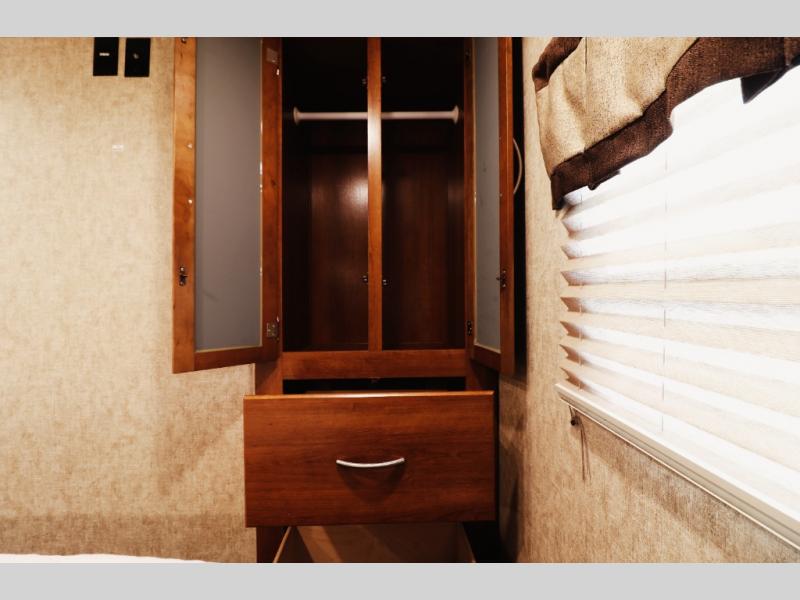 Smart cabinetry & finishes: solid cherry-hardwood frames, ball-bearing drawer glides, premium vinyl and carpet combo flooring, pleated shades, and panoramic windows for brightness and durability.