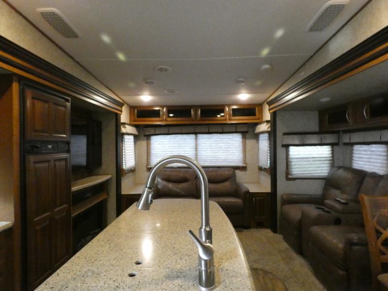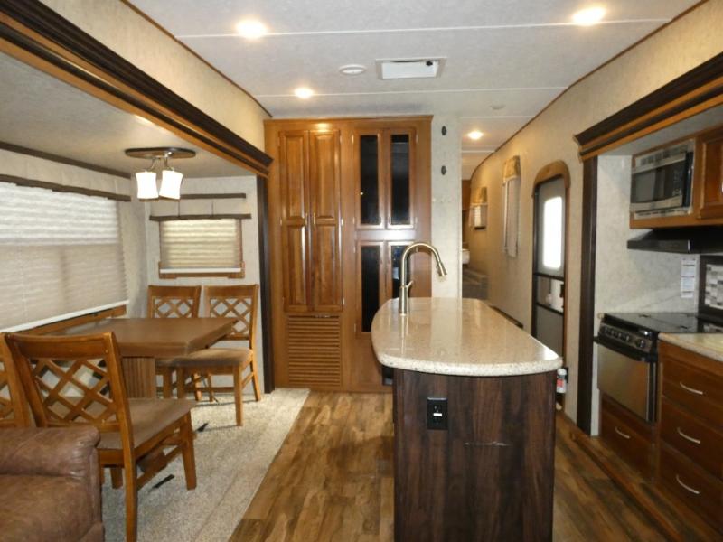 As you enter the fifth wheel, to the left is a slide out with a three burner range, refrigerator, and large entertainment center. Along the rear wall there is a hide-a-bed sofa with end tables. The other slide out has theater seating and a dinette. In the middle of the kitchen you will find a handy kitchen island with a double kitchen sink. Along the interior wall there is a closet and a pantry.