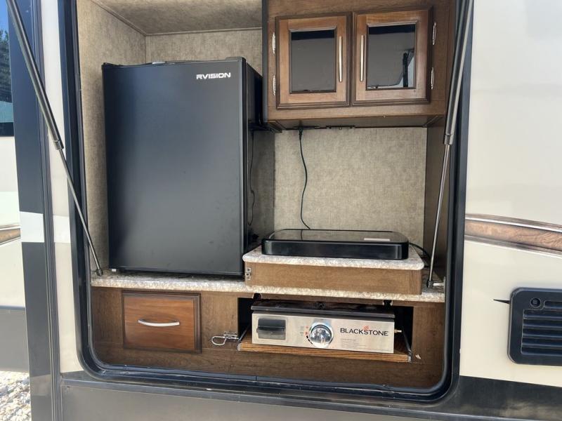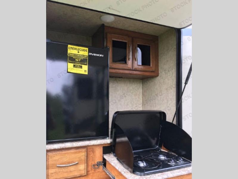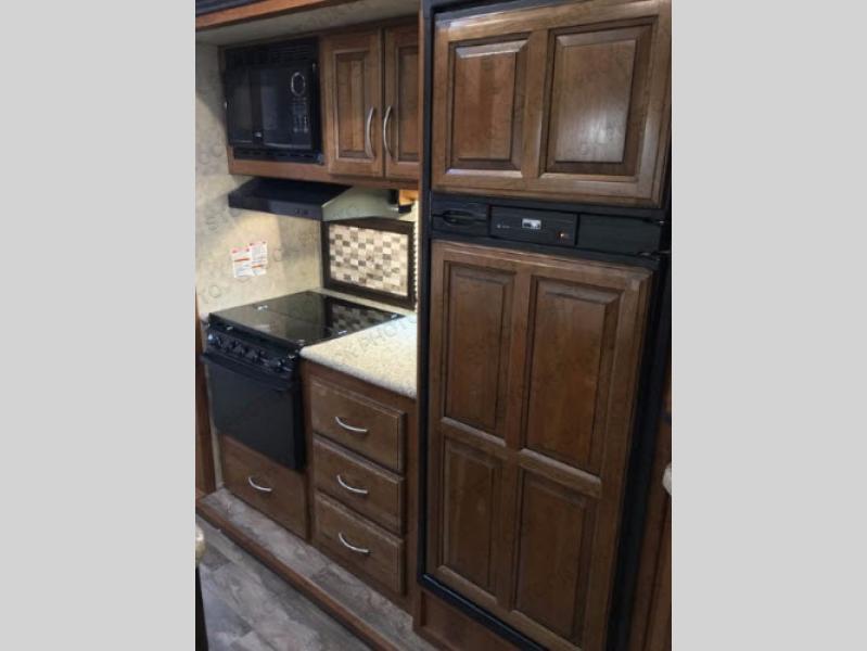 Check out the cooking area before heading inside. Along the curb side within the outer slide you will find a refrigerator, overhead storage, and a two burner cook-top. This will make cooking meals easy when you want to enjoy the great outdoors.