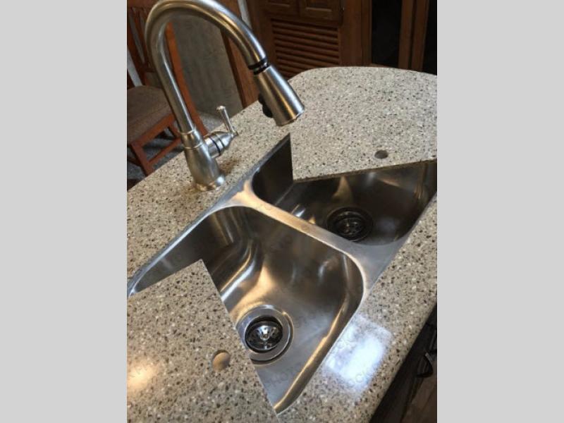 On the inside you will also find cooking your favorite meals easy with the amenities provided. There is a three burner range to the left as you enter, along with an 8 cu. ft. refrigerator, and counter space. You will find the center island handy for food prep and clean-up as it also features a double sink. There are plenty of storage cabinets above and below the counter top, and a nice storage pantry can be found along the interior living room wall straight inside the door. Next to it is a closet for additional storage.