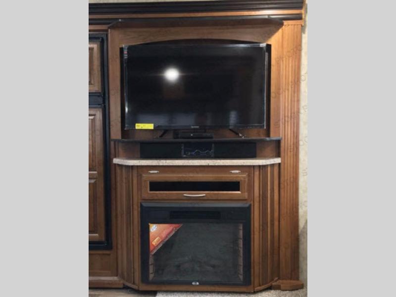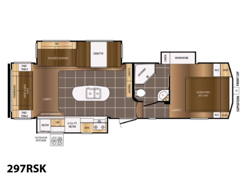 The slide out that features the kitchen appliances also features a entertainment center that can easily be viewed by all of the seating in the room. Along the rear wall there is a hide-a-bed sofa with end tables and storage overhead. Opposite the entertainment center find a second slide out that features theater seating and a booth dinette. There is storage above the theater seats, and the dinette can easily be turned into sleeping space at night when needed.