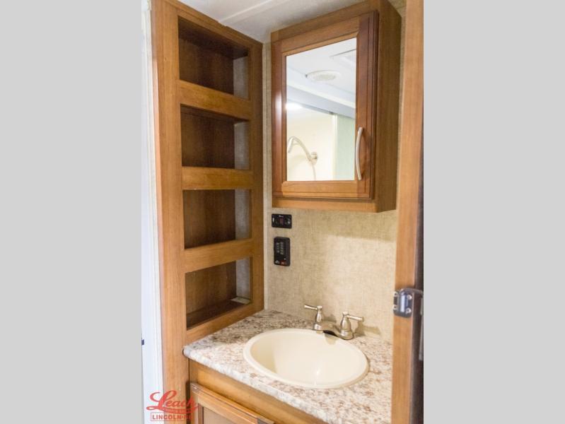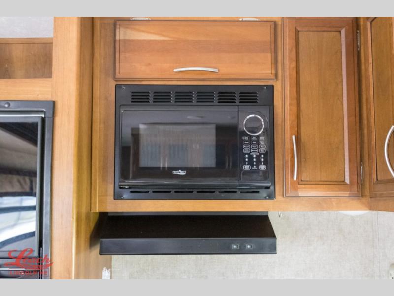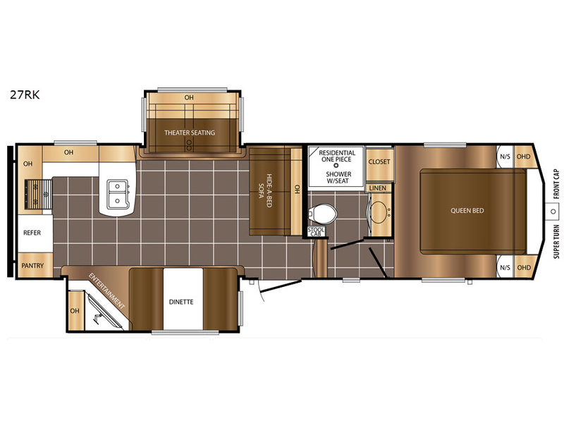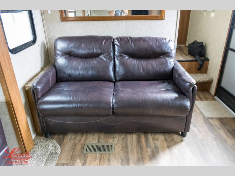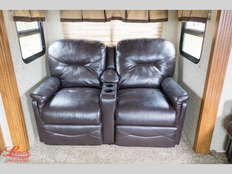 A road side slide out with theater seating for two and overhead cabinets is next to the hide-a-bed sofa along the interior wall. This makes a great space to visit with family and friends.