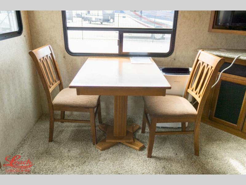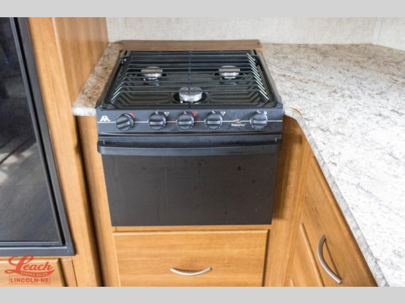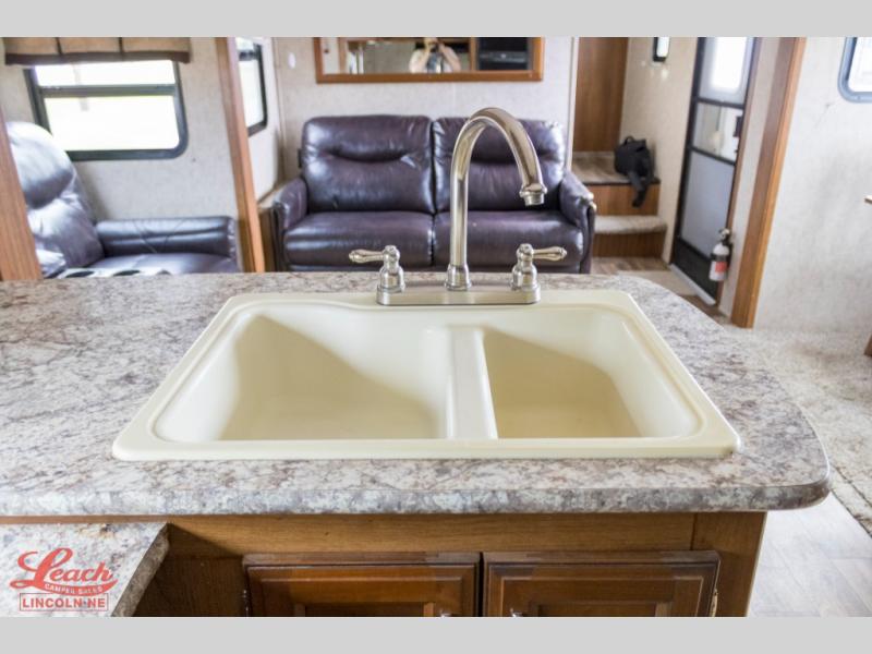 In the rear kitchen area you will find, along the rear wall of the fifth wheel a pantry, refrigerator, and three burner range. The countertop continues to the road side wall providing overhead storage for your pots and pans. A L-shaped counter provides additional work space and a double kitchen sink for easy cleanup.