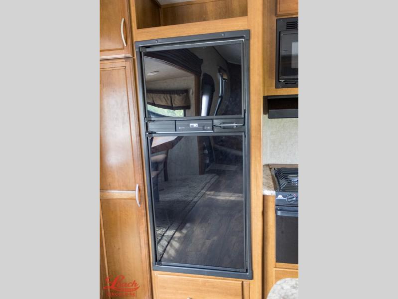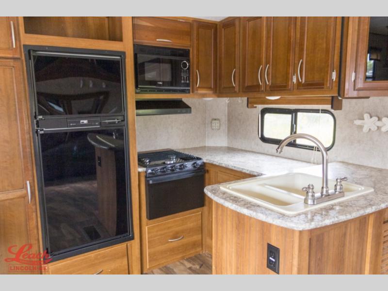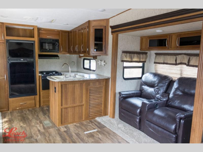As you enter this Crusader LITE 27RK fifth wheel by Prime Time Manufacturing, you will see that the kitchen is located in the rear.