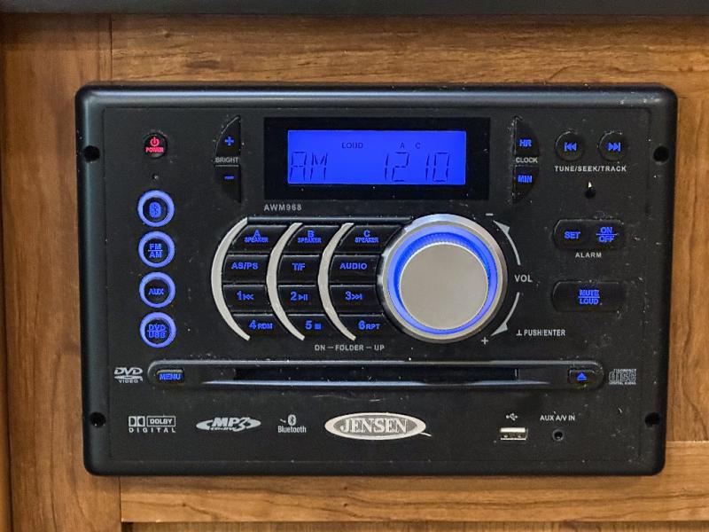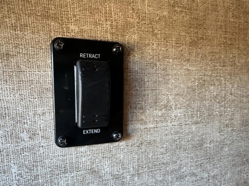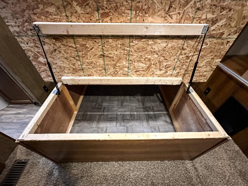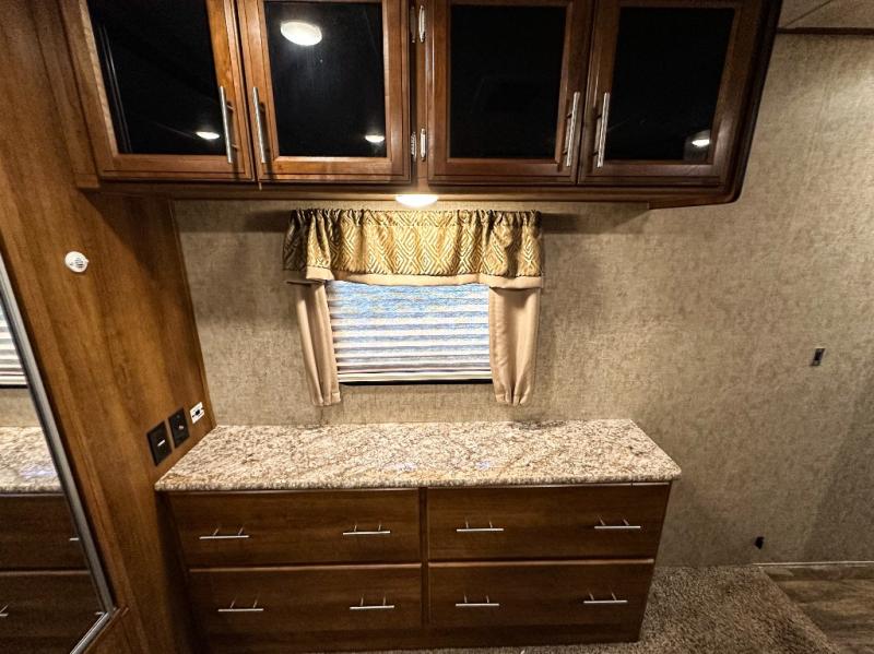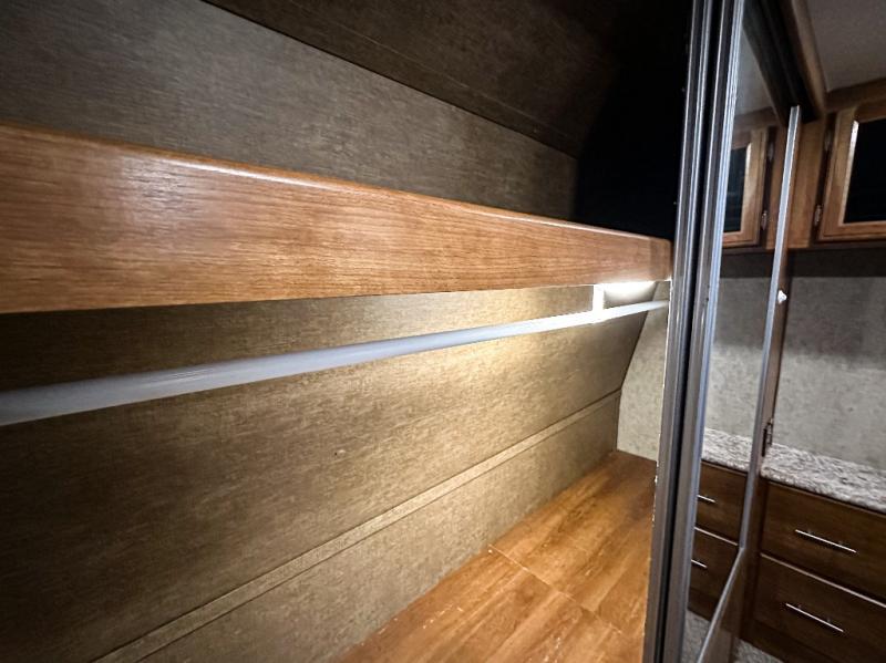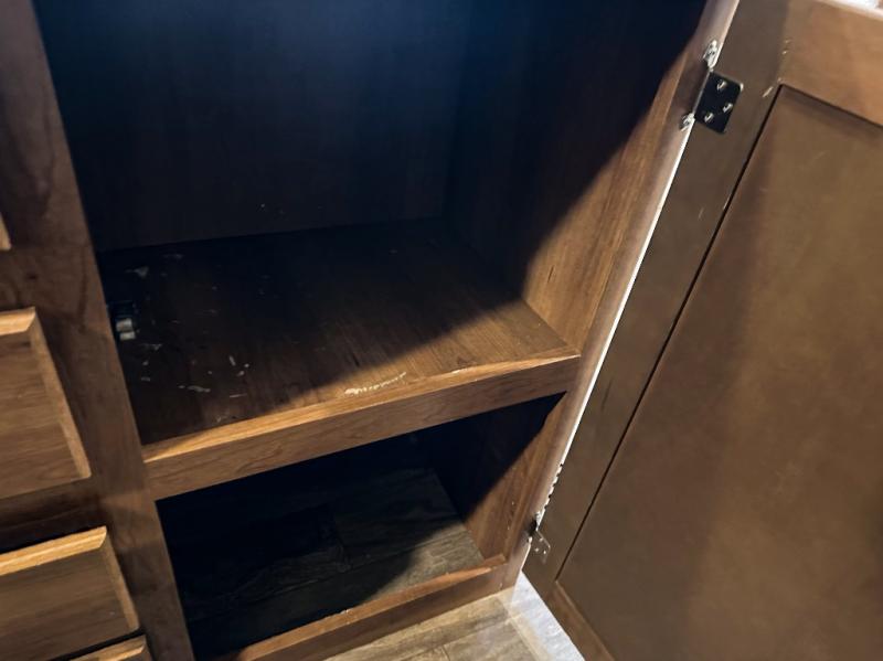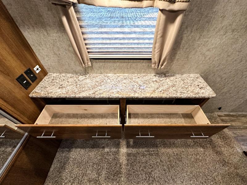 The front bedroom has a king bed slide out, full wall wardrobe with trunk storage and across from the bed you will find a chest of drawers and an overhead cabinet, plus much more!