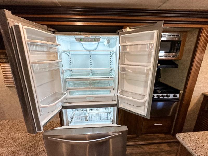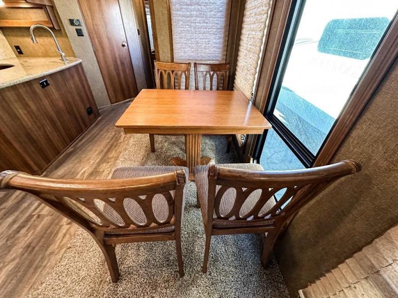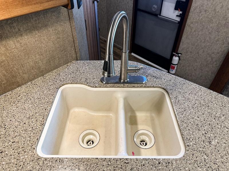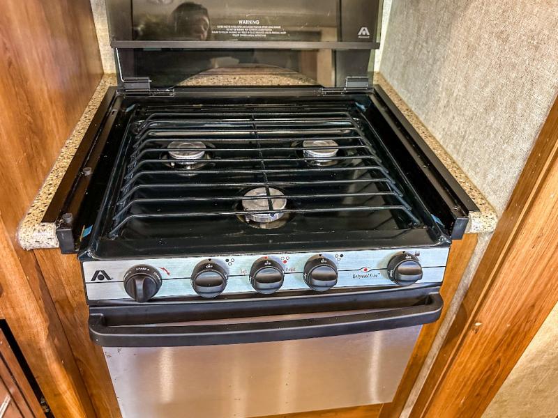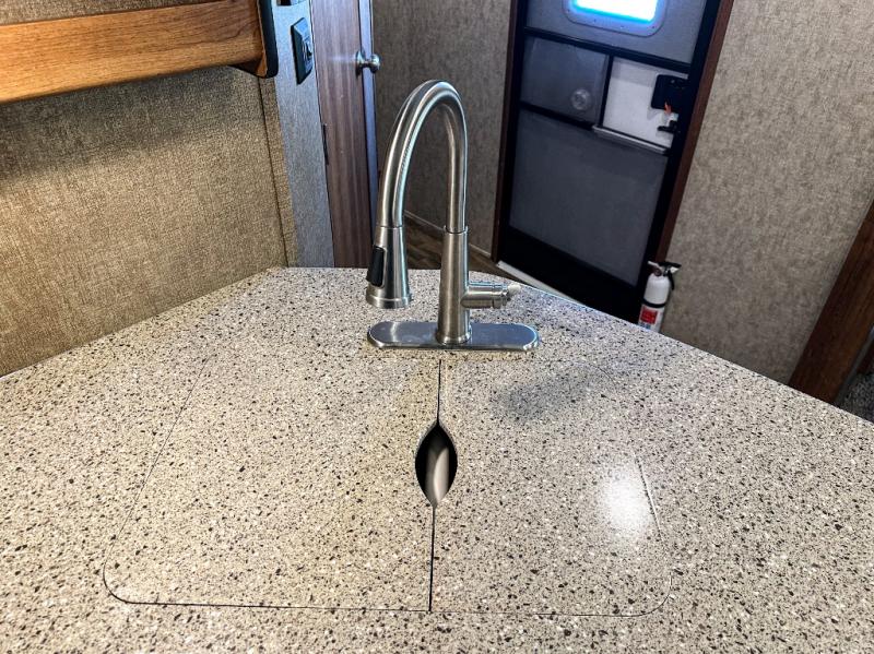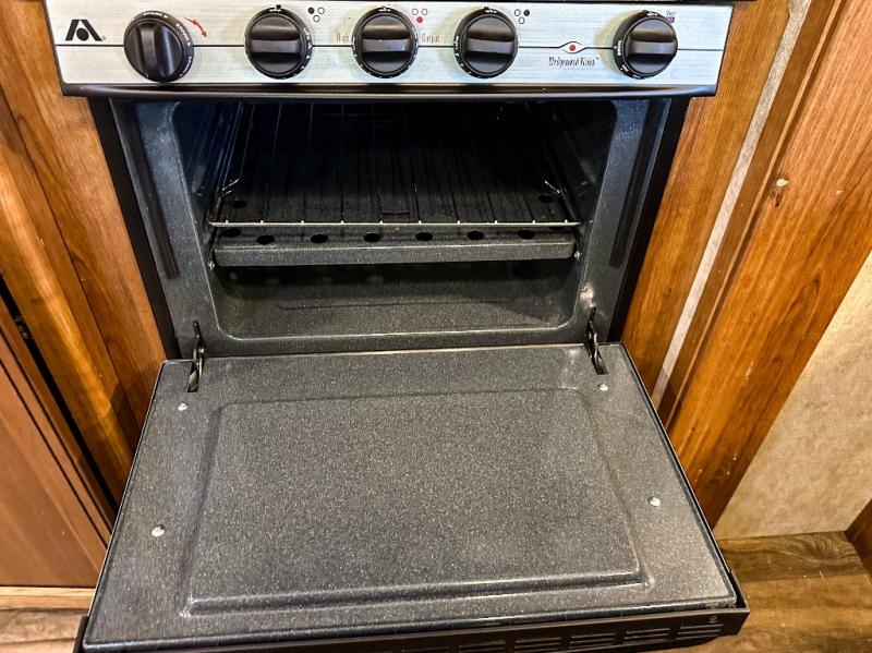 As you enter the travel trailer, to the left there is a slide out with a free-standing dinette and two recliners. Along the rear wall you will find an entertainment center. The slide out along the road side features a hide-a-bed, a refrigerator, a pantry, and a three burner range. There is a l-shaped counter which provides much counter space as well as a double kitchen sink.