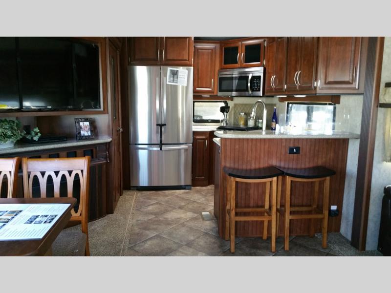 As you enter the fifth wheel along the right side there is a slide with a free-standing table and chairs, an entertainment center, and a pantry for your dry goods. The rear and road side kitchen area has a residential refrigerator, three burner range, l-shaped counter, double sink, and two bar stools. There is a second slide in the main living area with a hide-a-bed sofa and overhead storage. Adjacent to the slide you will find theater seating for two with cup holders.