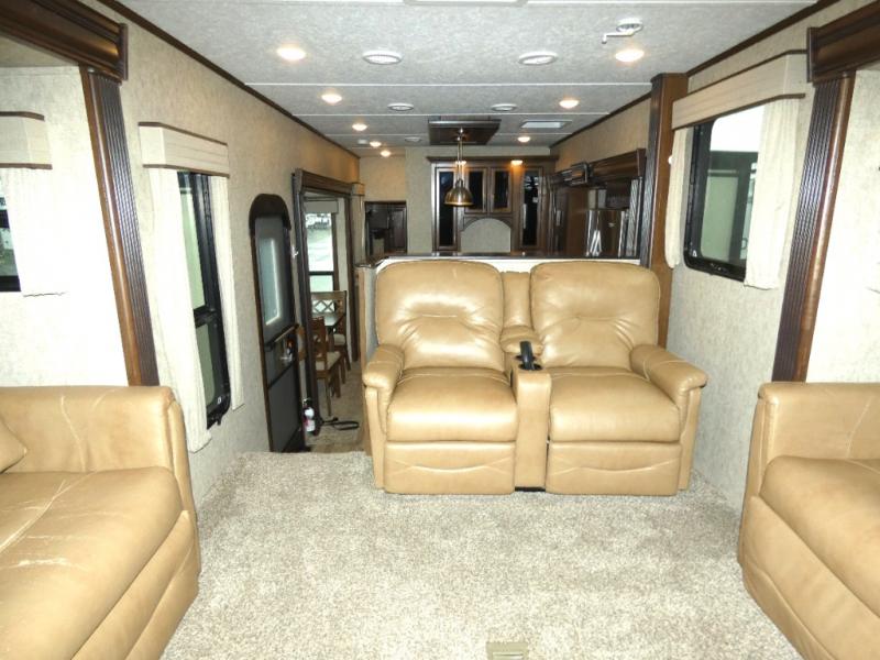 The living room is at the top of the stairs. You can relax on the theater seating, or one of the two hide-a-bed sofa slide outs. Along the front wall of the fifth wheel you will can enjoy the entertainment center, and more!