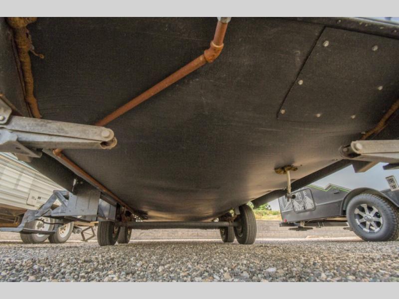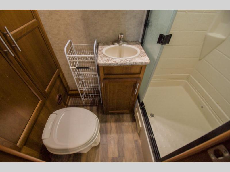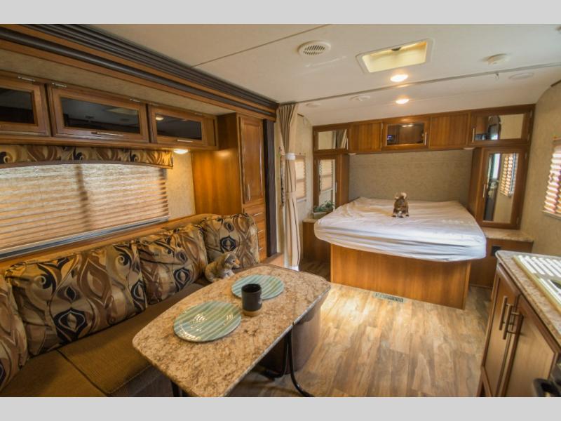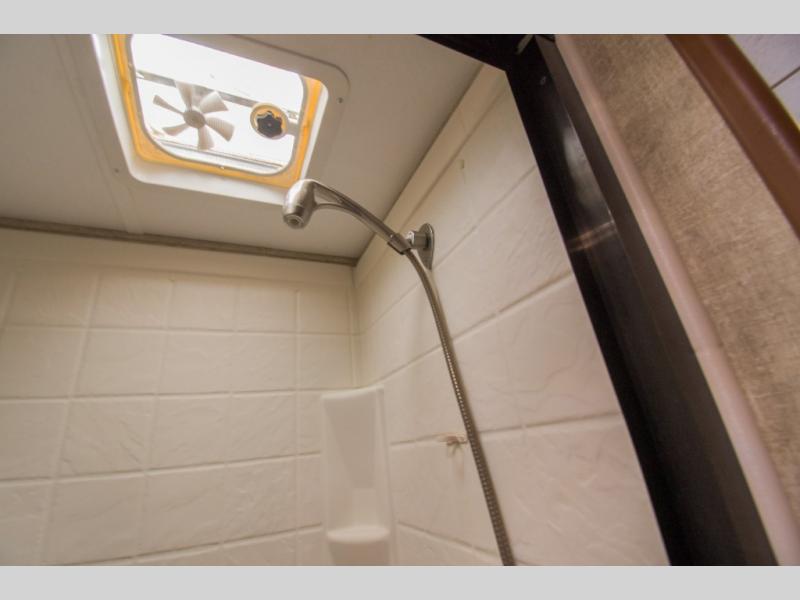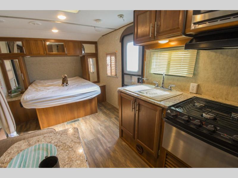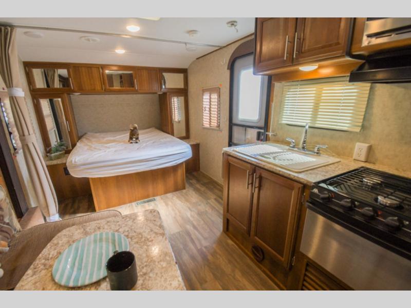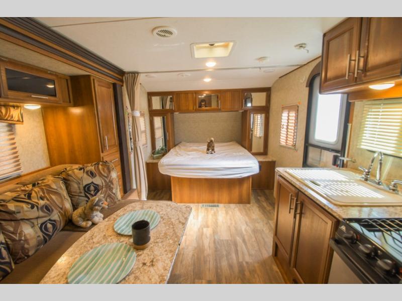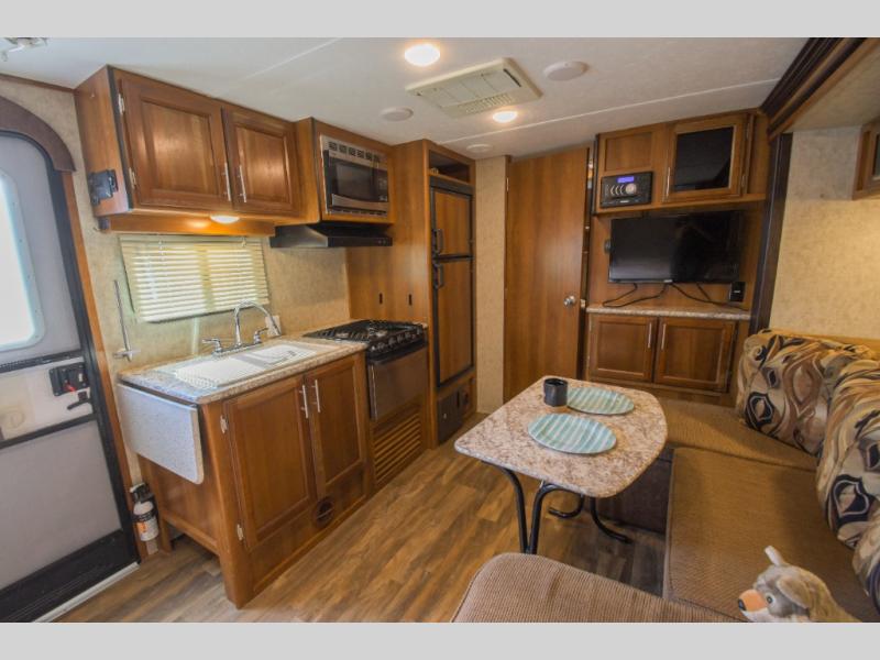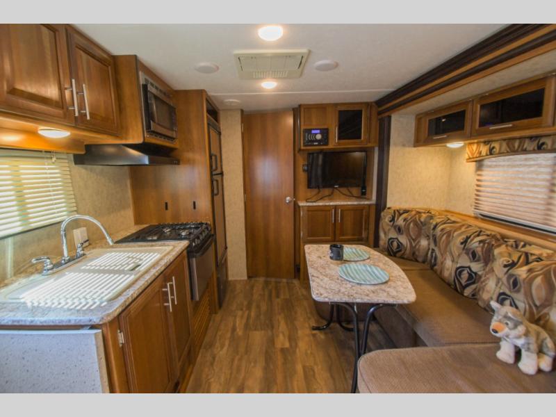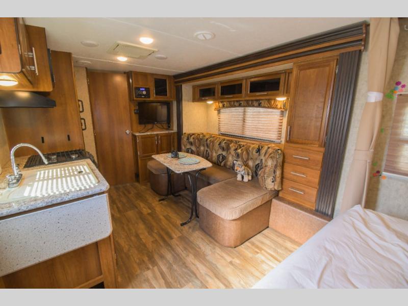 As you enter to your left there is a double kitchen sink, three burner range, and a refrigerator. The opposite side has a slide out u-sofa with a u-dinette table and a pantry. Next to the slide you will find an entertainment center for your inside enjoyment.