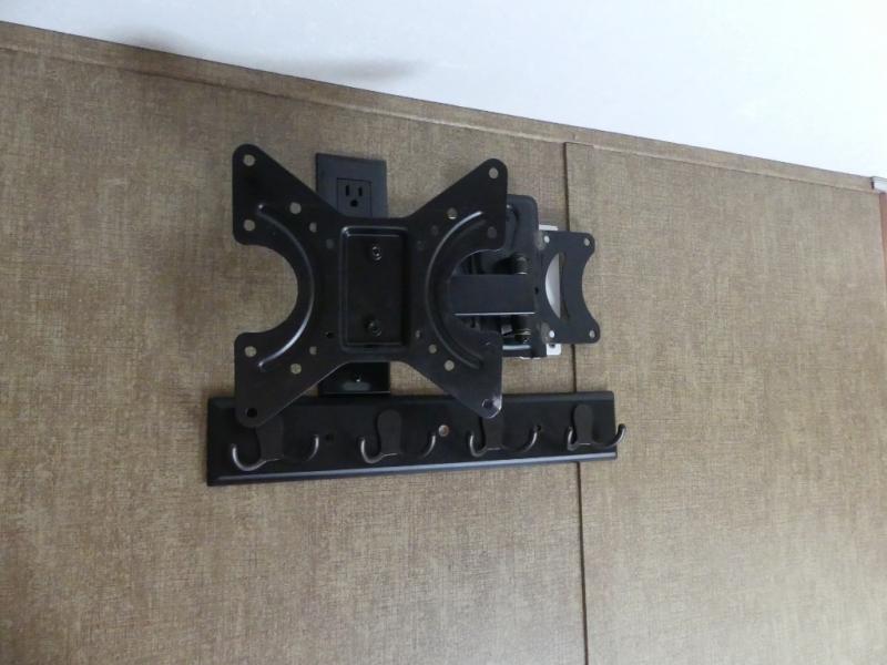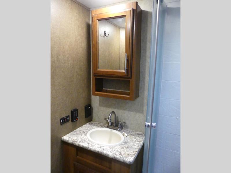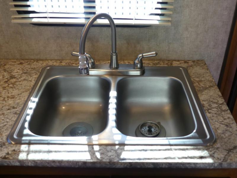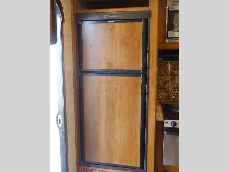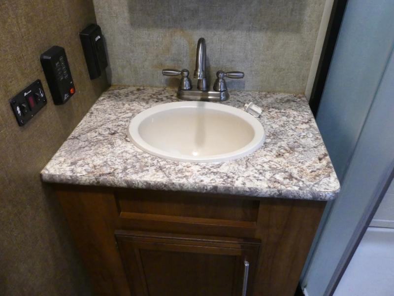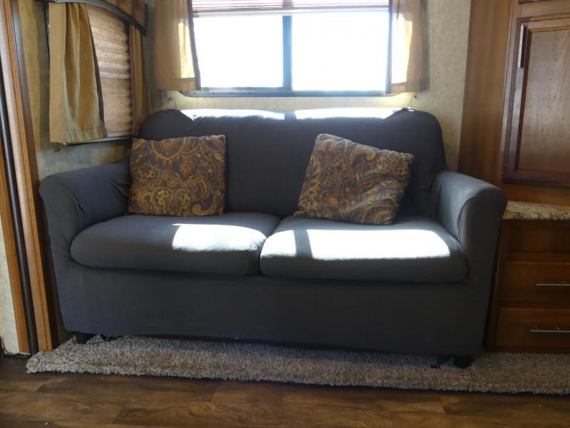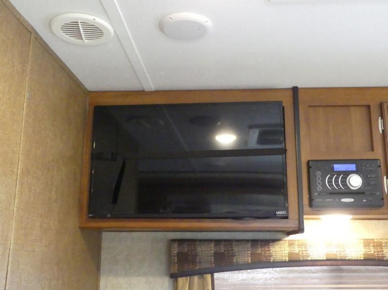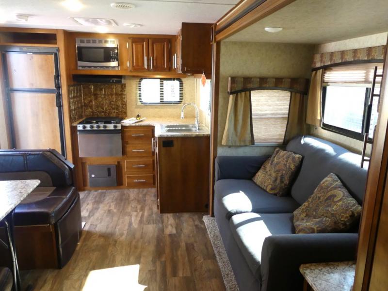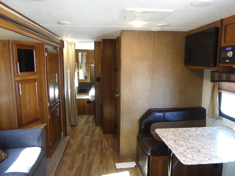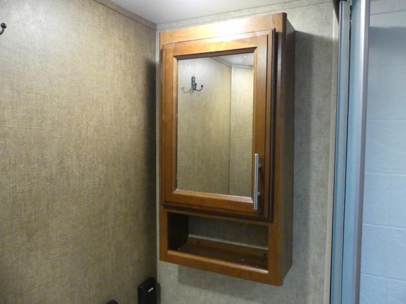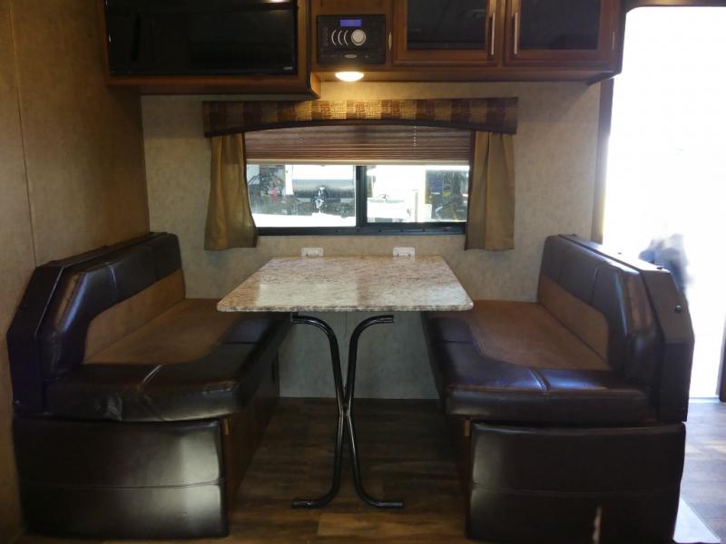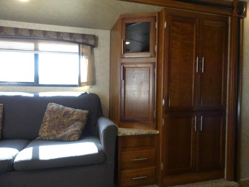The single road side slide has a hide-a-bed sofa, overhead cabinets, and wardrobe. Across from the slide there is a dinette, overhead cabinets, and an entertainment center for your inside enjoyment.
