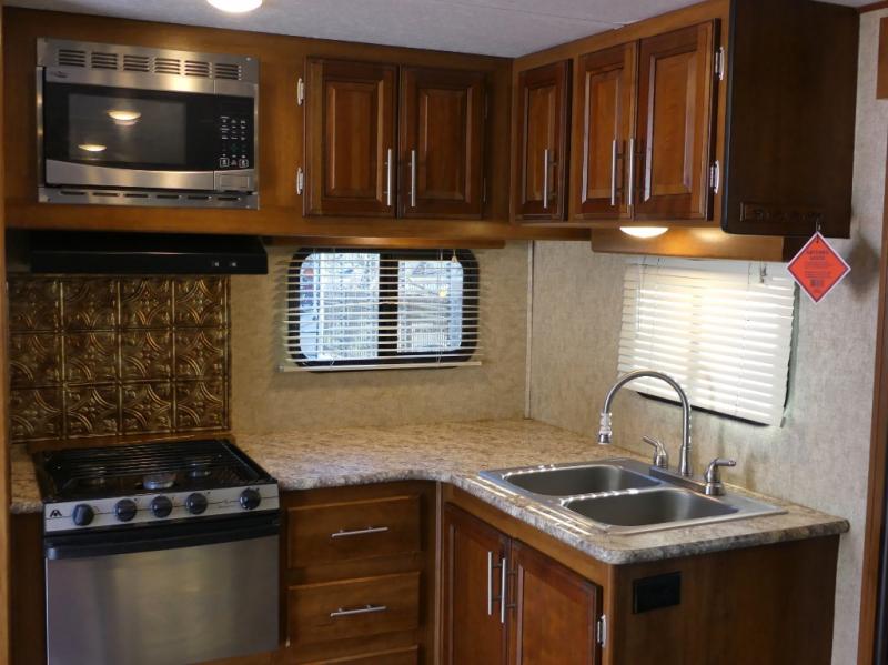 You can easily fix meals and snacks at the rear kitchen in this Tracer AIR travel trailer by Prime Time RV. This model also features a single slide, and a front bedroom.