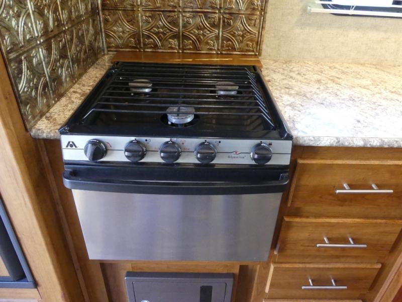 As you enter 253AIR to your left along the rear there is a refrigerator, three burner range, extra counter space, overhead cabinets, and a double kitchen sink.