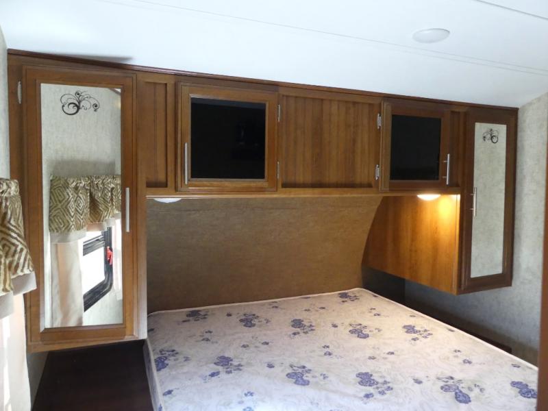 After a day of outdoor adventure, retreat to the front bedroom where you will find a queen bed, dual shirt closets and nightstands, overhead cabinets, a privacy curtain, and so much more!