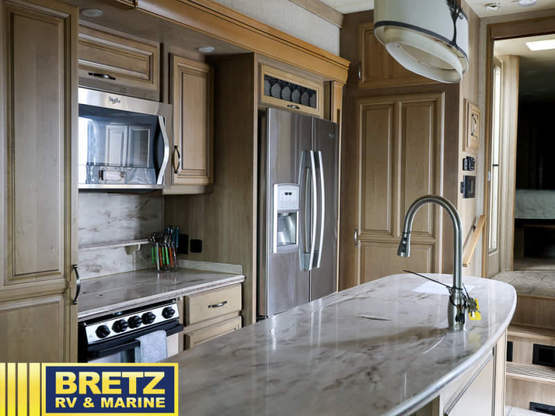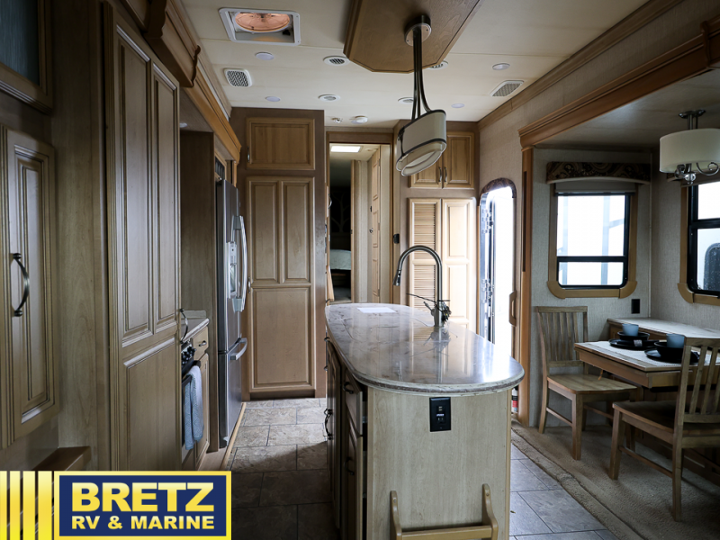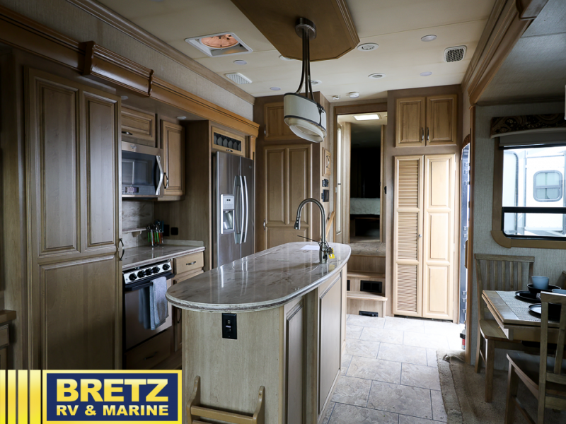 The slide opposite the door side features an entertainment center with a LED HDTV and pull-out desk with chair. There is also a large pantry, a three burner range with microwave oven overhead, and refrigerator within the same slide. A second pantry can be found adjacent to the slide for even more storage space for your dry and canned goods. A convenient kitchen island offers plenty of counter space, a lage sink, and lower cabinets and drawers.