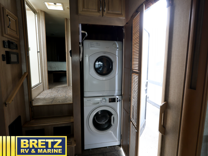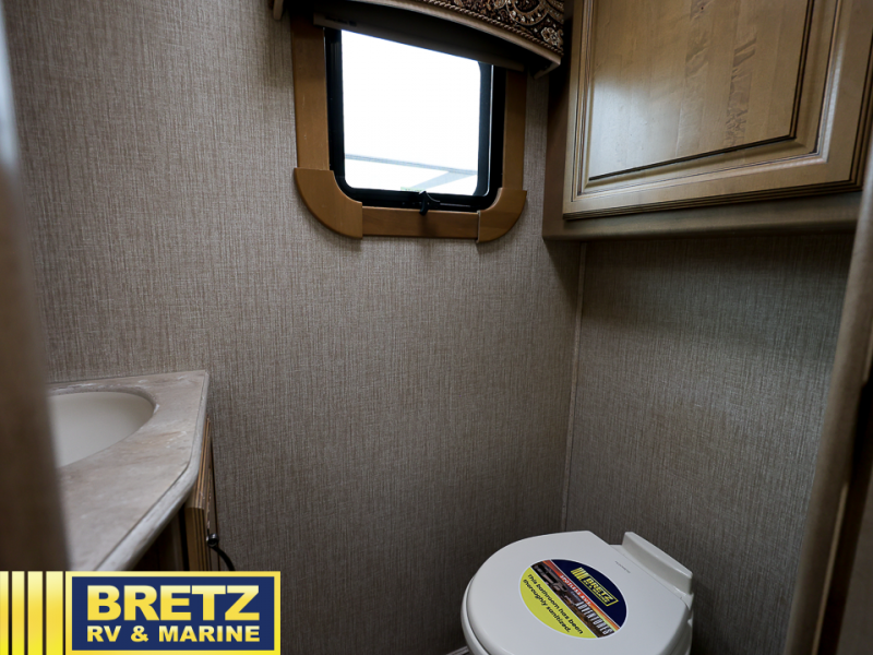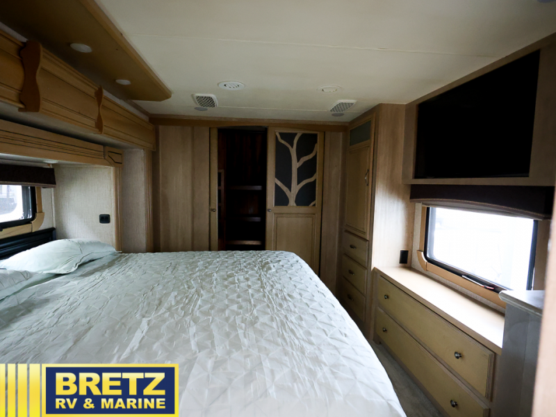 What I liked most: Very nice exterior paint, lettering, and graphics. Aluminum steps, huge pass trough storage with shelving. Extra long island kitchen with lots of storage. Very spacious master bedroom with plenty of cabinet drawers and a large well decorated wardrobe.