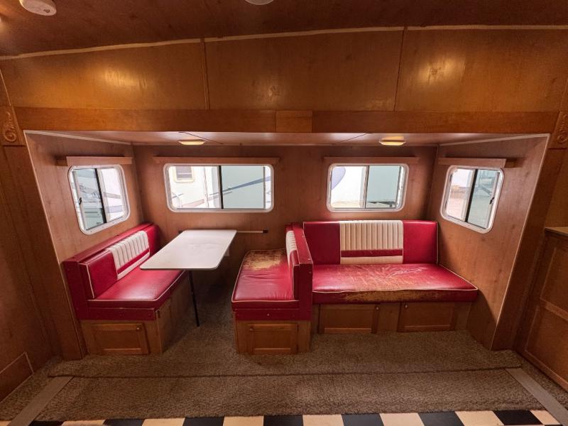 Located in the rear you will find a bathroom with a sink, angled shower, and toilet. The opposite rear corner features a set of bunk beds.