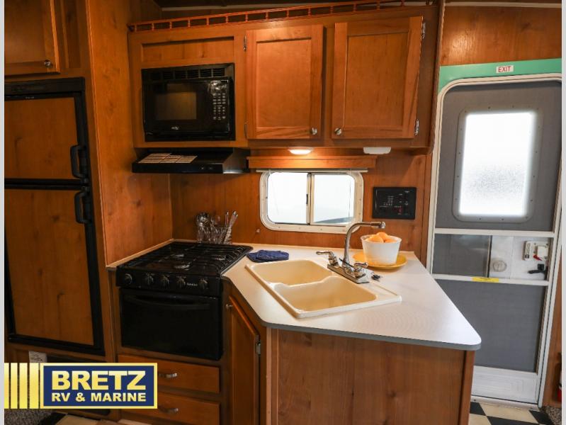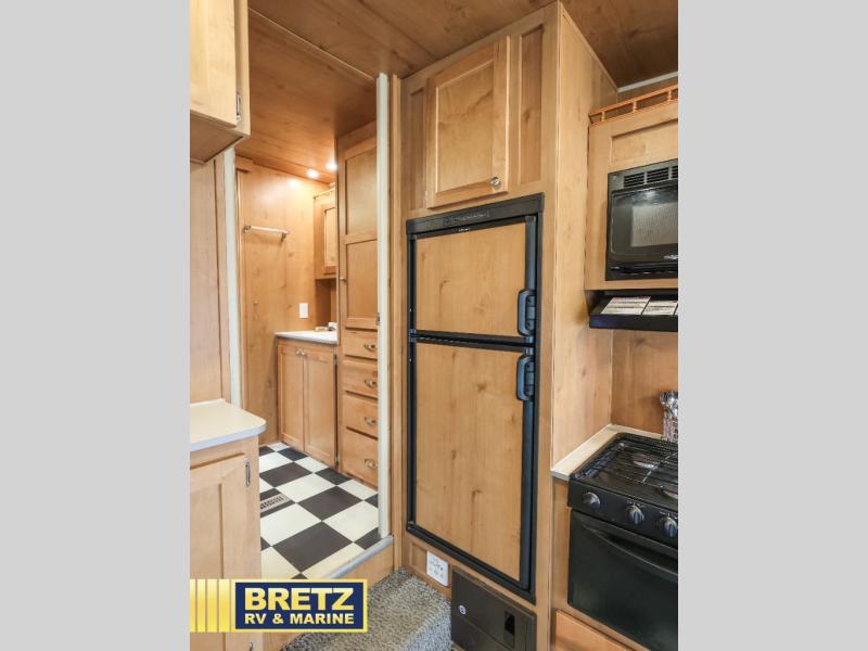 All of the kitchen amenities are located along the door side of the fifth wheel. Here you will find an angled double sink, overhead cabinets for dishes, a two burner range, and a refrigerator for all of your perishables items.