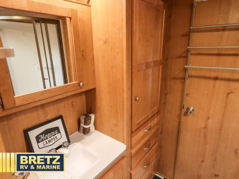 Step up to the bathroom and bedroom area. In the walk-through bathroom you will find a sink and large closet along one side of the fifth wheel. The opposite side features a radius shower and a toilet.
