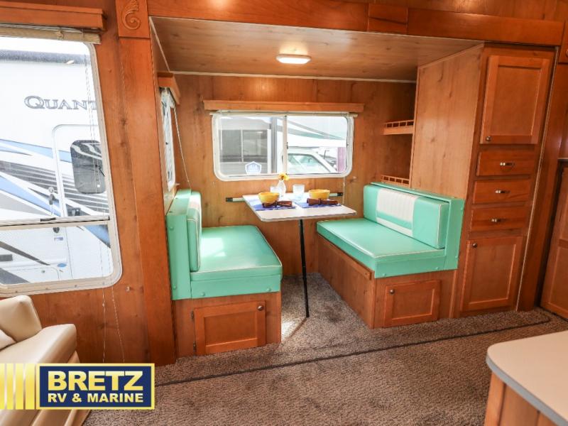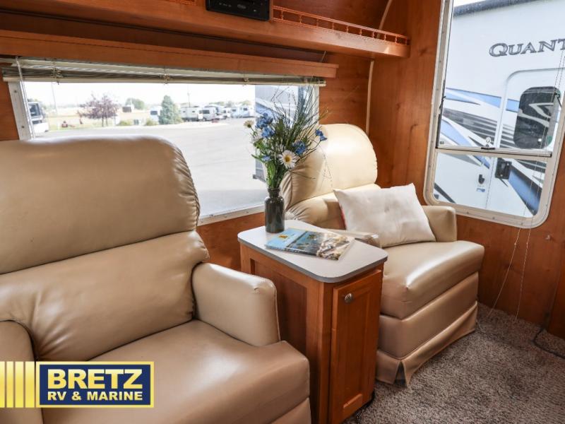 Along the rear wall there are two lounge chairs and an end table. The slide out featured along the road side is where you will find the dinette with overhead cabinets, and a large pantry. You can easily convert the dinette into additional sleeping space at night. The interior wall adjacent to the slide out features a TV location for your enjoyment!