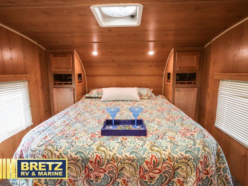 Step up another step into the front bedroom. Here you can rest and relax on a queen bed with overhead storage and cabinets along either side of the bed, plus more!