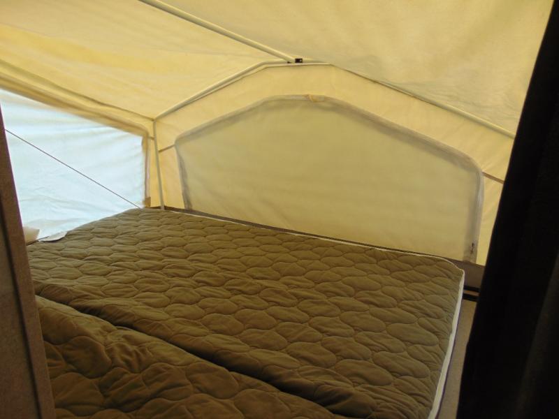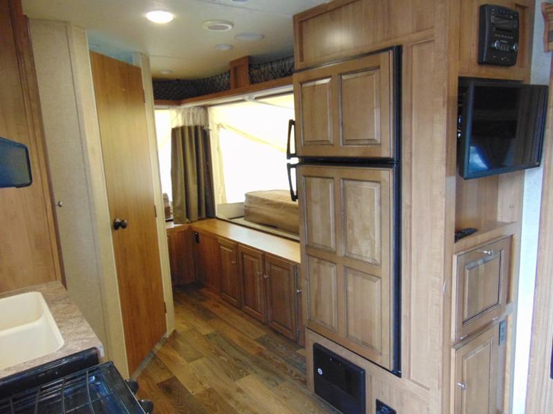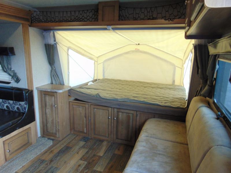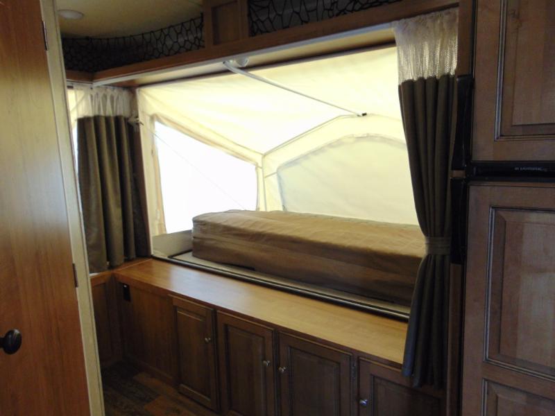 There is lots of extra sleeping space inside this Rockwood Roo 233S. Three queen tent end beds, located in the front, rear, and road side along with a single slide out helps open up the living space in this expandable travel trailer by Forest River. Storage shelves are located above all three tent openings, with storage space below the road side bed.