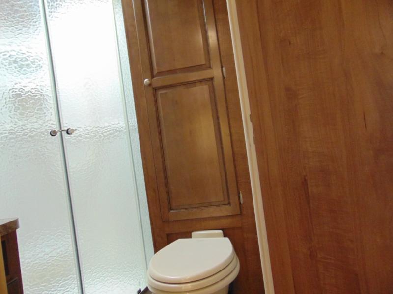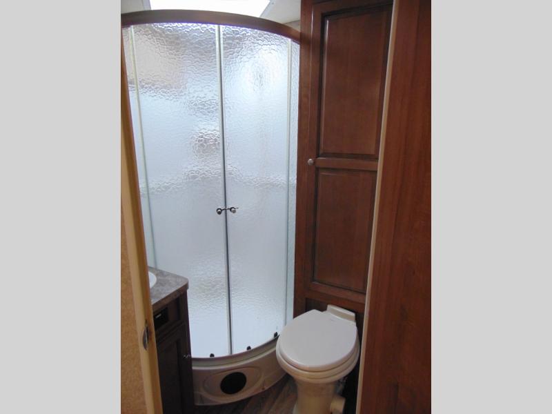 The bathroom in the rear corner includes a toilet, linen storage, radius shower, vanity sink and medicine cabinet.