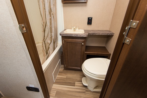 In the center of the unit along the road side wall find a convenient bathroom located straight ahead through the main entry door. There is a 36" tub/shower, toilet, and vanity with sink, plus medicine cabinet.