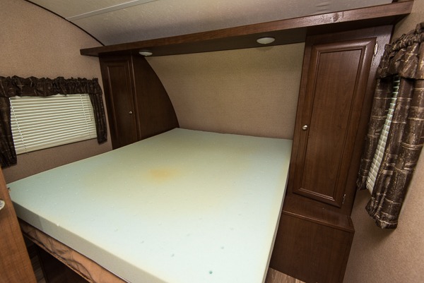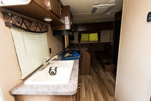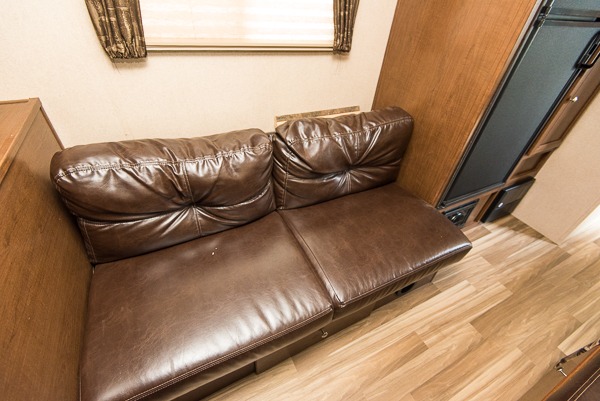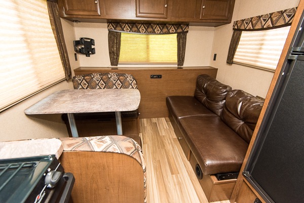 All the way to the rear of this Shasta Flyte trailer there is a booth dinette where you can enjoy all of your meals, and a 60" sofa that can easily be transformed into sleeping space at night. The entertainment center along the rear wall offers a spot to add a TV if you choose, plus so much more!
