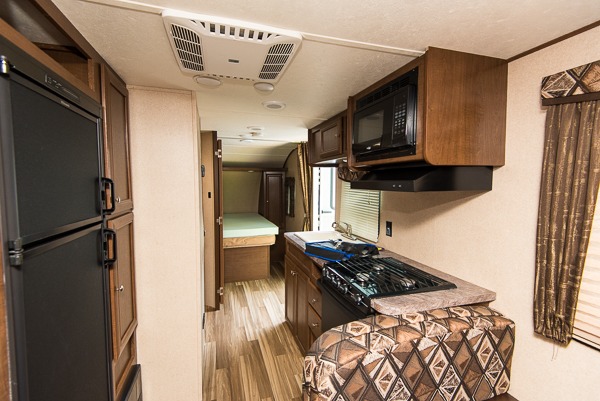 Opposite the bath and to the left of the main entry is a double sink, a three burner range, and overhead storage cabinet. Opposite find a pantry with even more storage along with a 6 cu. ft. refrigerator to keep all of your perishables cold and fresh.