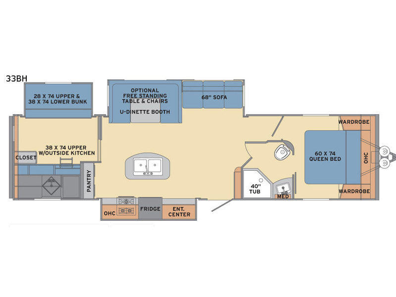 At the rear, a private bunkhouse is the perfect hang out for the kids! With a slide on one side including a 28" x 74" upper bunk, and 38" x 74" lower bunk, the floor space really opens up. You may choose an optional 42" dinette with a flip bunk that is perfect for game time, or maybe an optional 68" sofa with a flip bunk for relaxing would be better for your family. The choice is totally yours. Opposite the bunk slide you will find a closet and another 38" x 74" bunk above storage with an outdoor kitchen below.