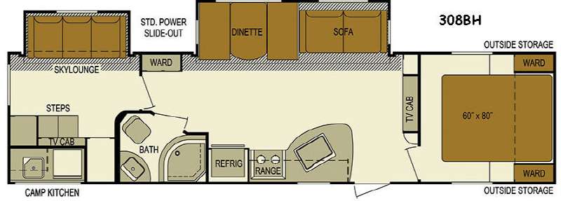 Your larger family will love this Nomad travel trailer model 308BH featuring double slides, a rear bunkhouse where the kids will likely hang out, and an outdoor kitchen, plus more!