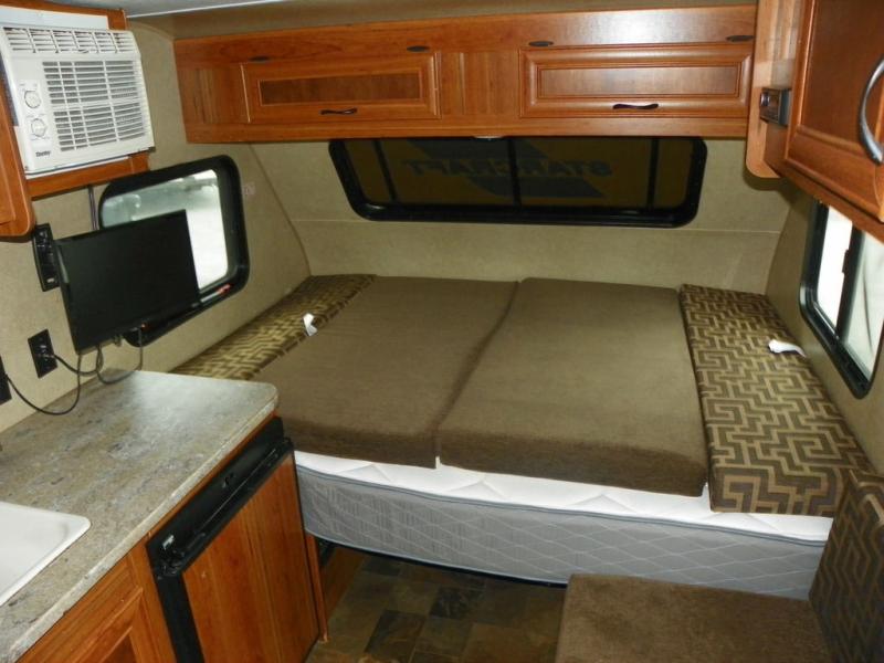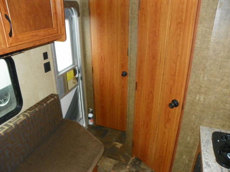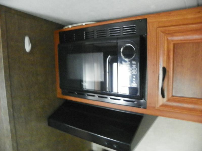 You can cook up light meals and snacks inside with the two burner cook-top and overhead microwave oven. There is also a refrigerator, single sink, plus overhead storage for a few dishes and other kitchen items.