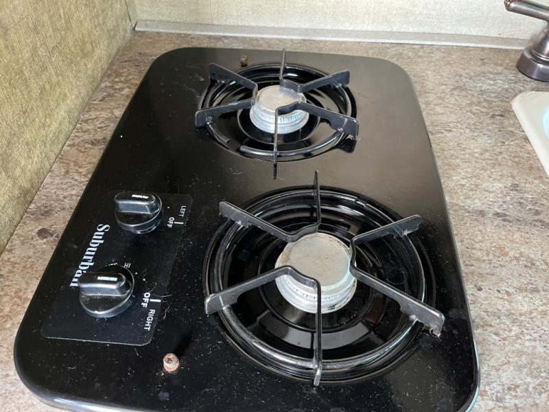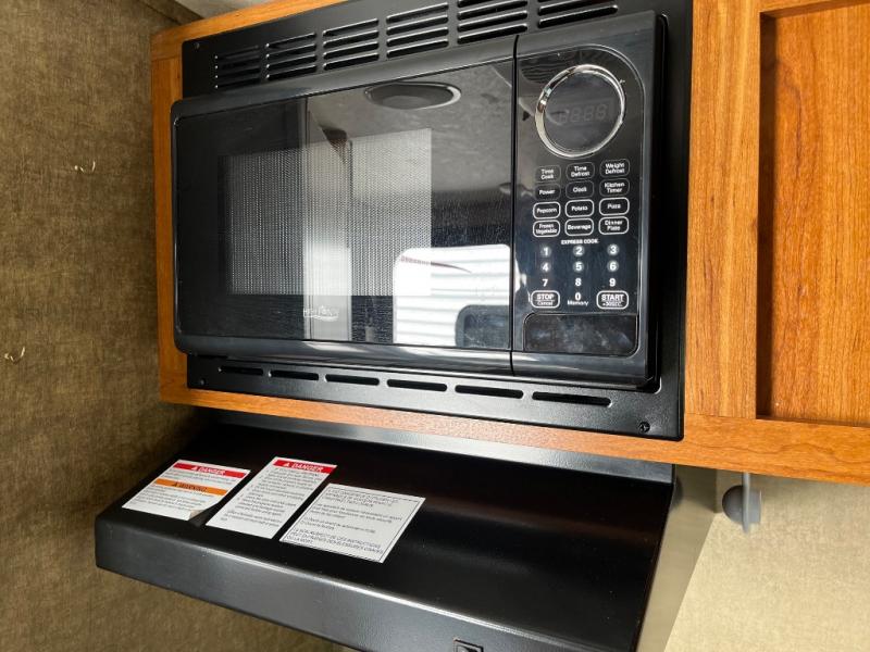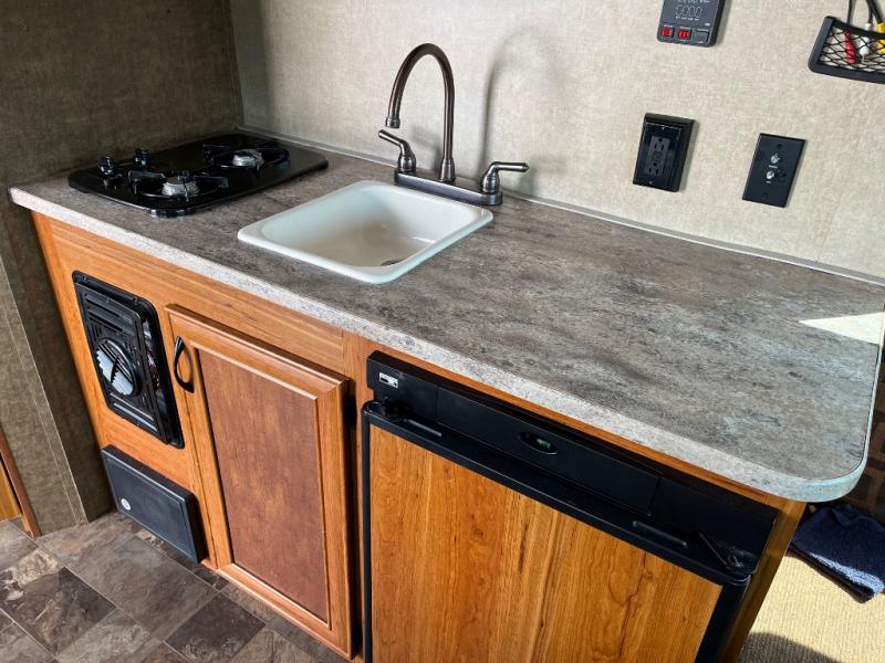 You can easily cook light meals and snacks with the two burner stove-top and microwave oven. There is also a refrigerator and single sink for easy cleanup. The overhead cabinets provide plenty of space for storage.