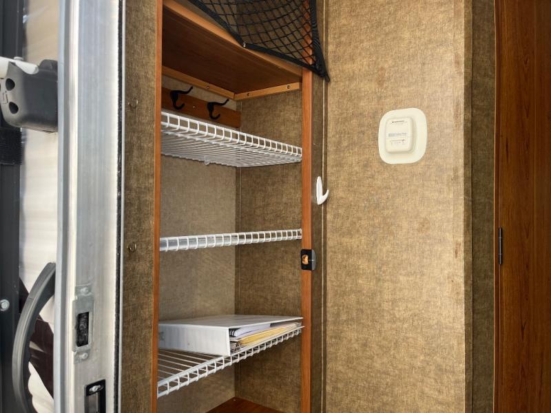 As you enter notice the handy wardrobe just inside the door on your left. The right side features a bench style seating with overhead cabinets.