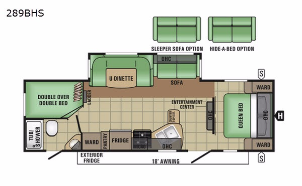 An entertainment center for your enjoyment with storage both above and below is centrally located on the interior wall. The entertainment center can easily be viewed by the u-shaped dinette and sofa slide out opposite the door side. In place of the sofa you can choose an optional sleeper sofa, or an optional hide-a-bed.